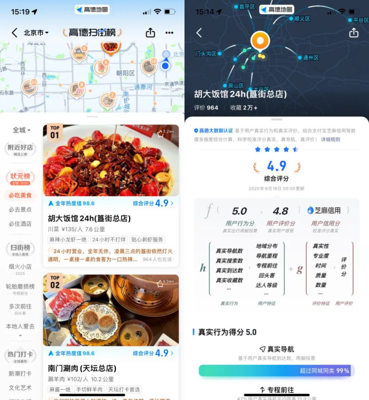 高德加入战局,也是顺理成章的事情。“扫街榜”,踩着竞对的“刷榜”“虚假评论”痛点出道,借了一道东风——真实用户评价需要长期积累,AI提供了超车机会,从用户轨迹沉淀数据中提炼核心价值内容。